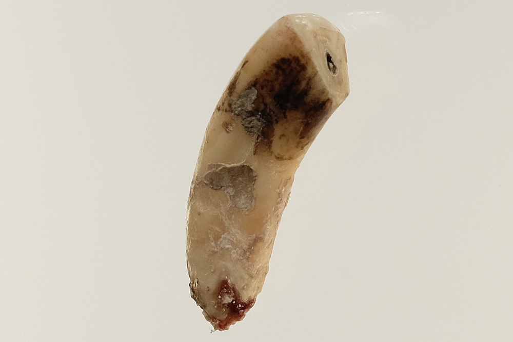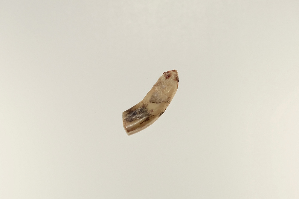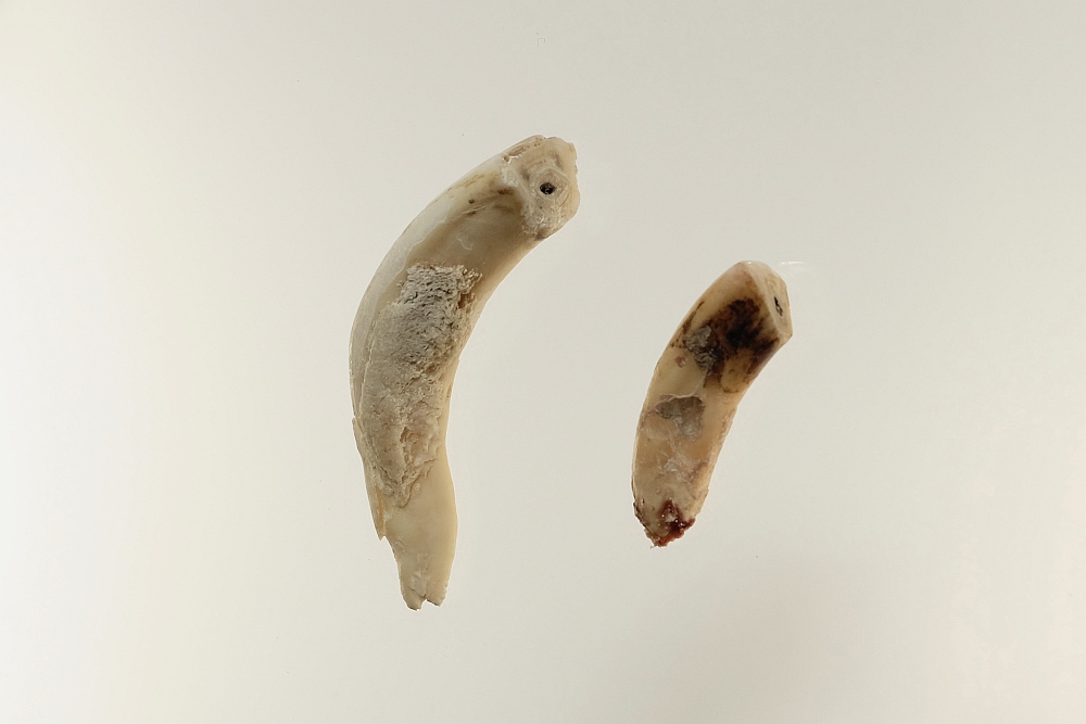 Der Wolfszahn ist vor dem ersten grossen Backenzahn ausgebildet (eigentlicher erster Backenzahn).Frisch gezogene Wolfszähne nach der Extraktion.